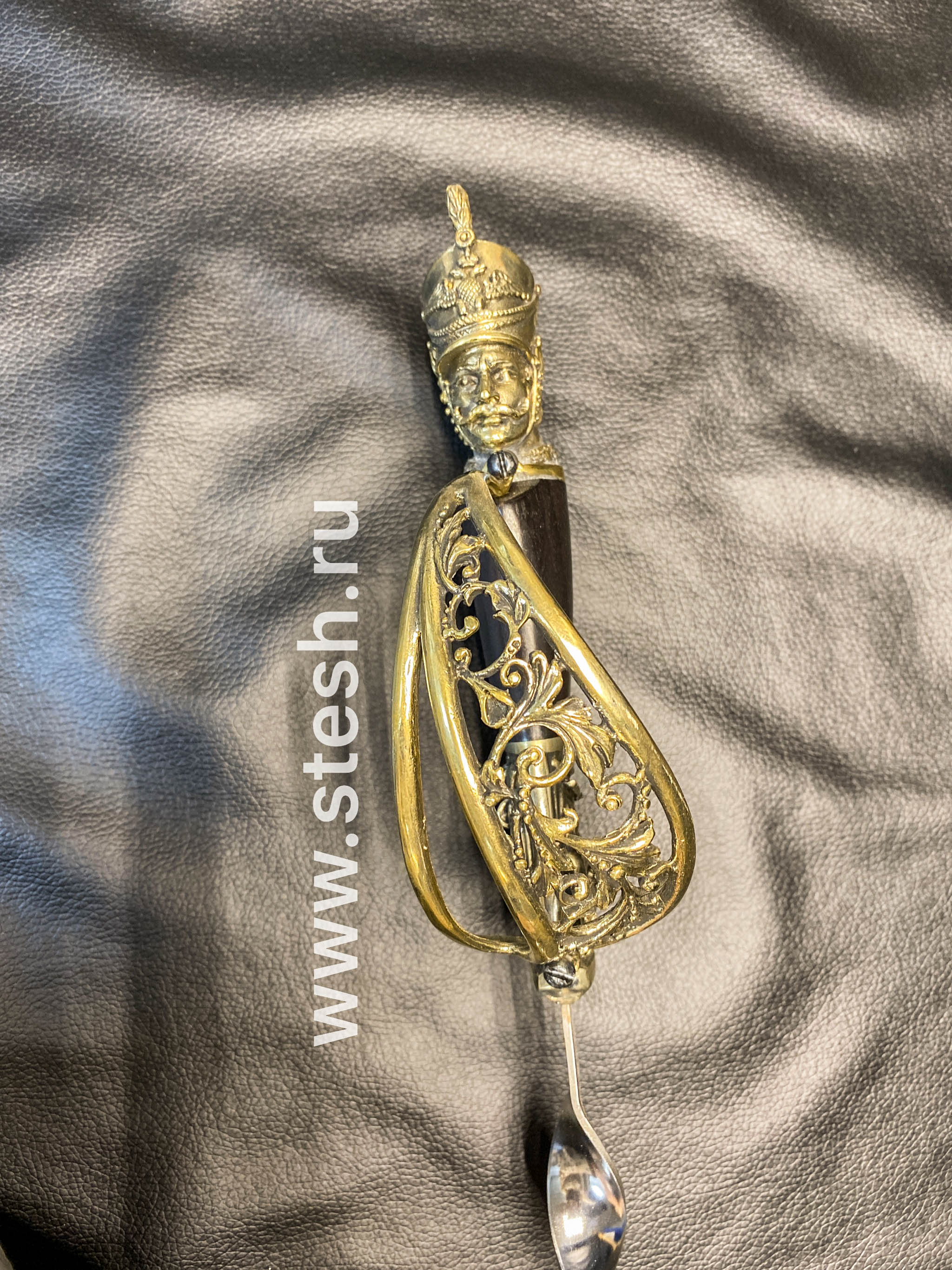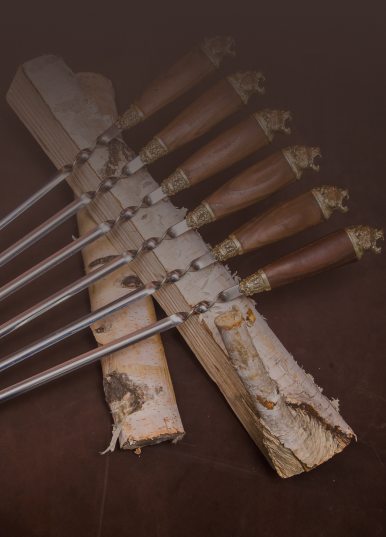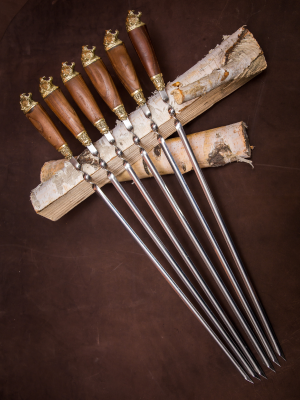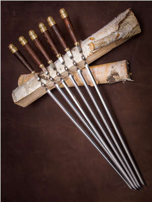 Материал навершия: художественное литье из латуни, дерево на выбор ВЕНГЕ или ГРАБ, лезвия шампура из нержавеющей стали согнуто уголком толщиной 2мм, длина 700 мм