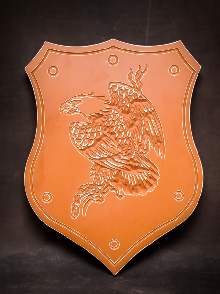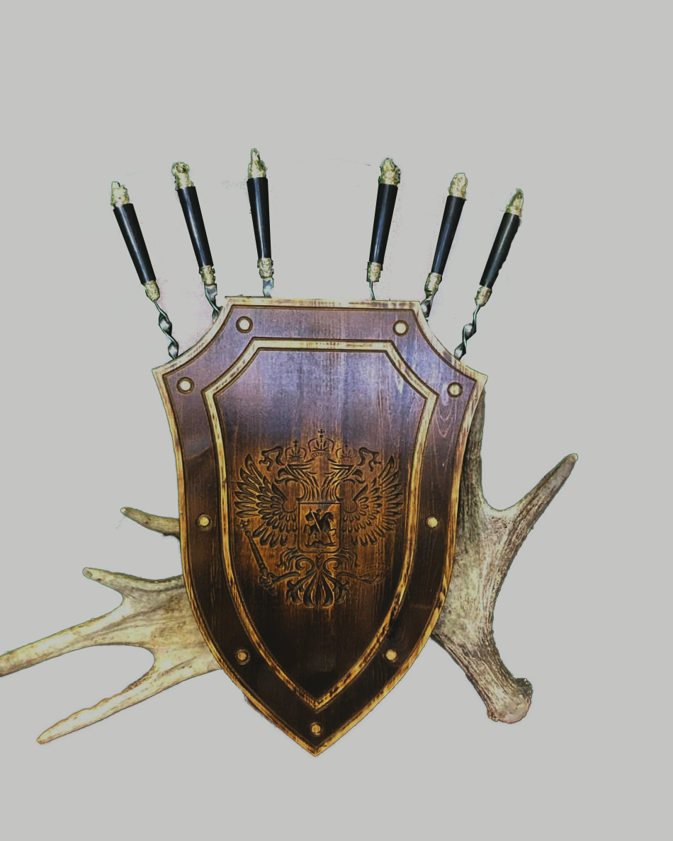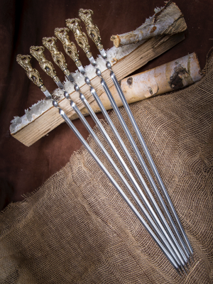 Материал навершия: художественное литье из латуни, лезвия шампура из нержавеющей стали толщиной 2мм (уголком или плоские), длина 680 мм