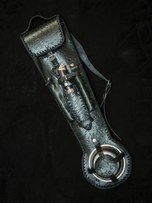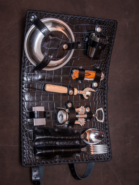 Колчан выполнен из натуральной кожи. В него входит 6 шампуров с художественным литьем, 6 вилок, 6 тарелок, 6 стопок, раскладной мангал, зажигалка, охотничий нож, топор.