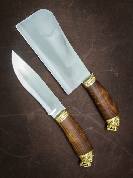 Сделаны из стали, художественное литье из латуни, рукоять - дерево граб (ножи) и венге или ясень (топоры). Идеально подойдут для пикника, туристического похода, охоты и рыбалки